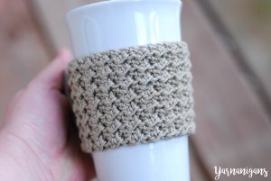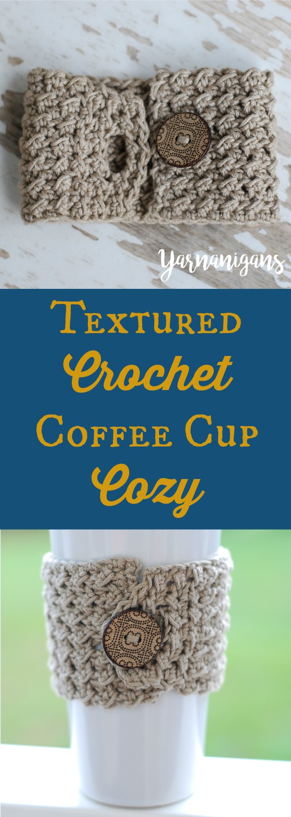Many times while walking from the car to my office I’ve found that my cup o’ joe is just too hot to handle, resulting in a constant juggle back and forth in my hands. I knew that I needed to put crochet to the task and find a stylish, coffee-carrying solution. Thus, my textured crochet coffee cup cozy was born!