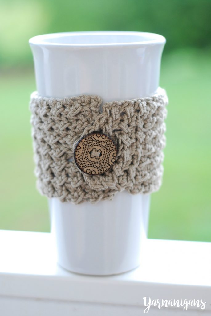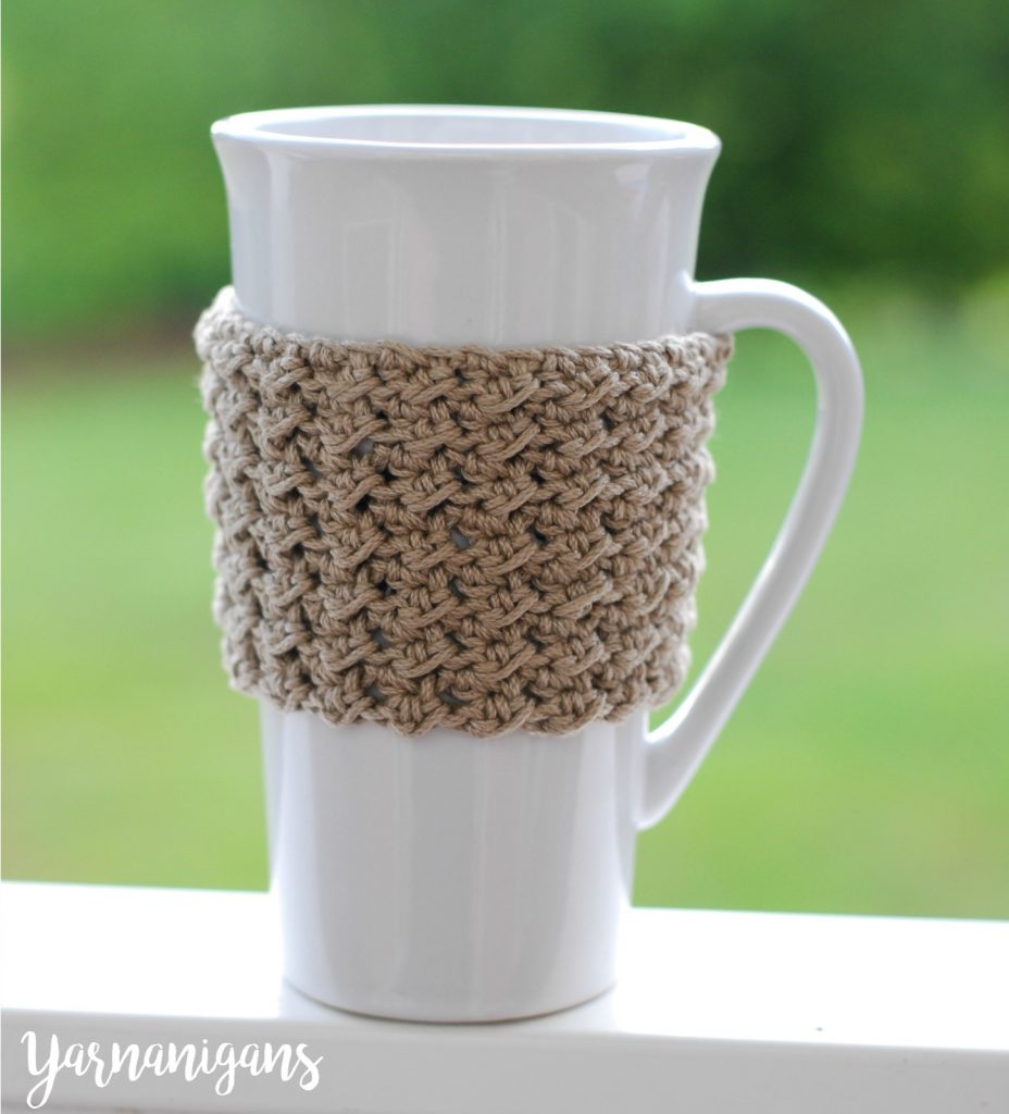 I now keep one of these in my purse or car at all times for my java run each morning. It’s easy to slip on to-go cups and is an Eco-friendly, reusable alternative to cardboard coffee sleeves. Additionally, I love the look and feel of the textured stitch used in this pattern.