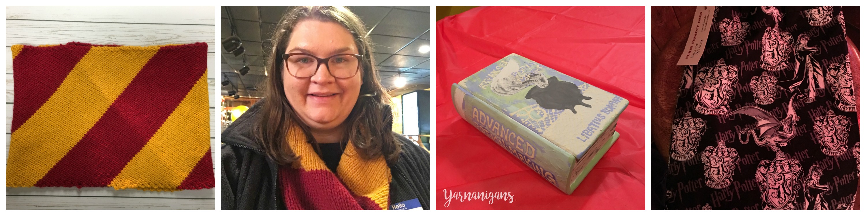 The event I attended was a pottery paint night at Fired Up Creative Lounge where you choose a pottery piece to paint in their studio. I had a really fun time decorating a book box and turning it into my very own copy of Advanced Potion-Making. While we painted, we ate HP themed snacks, drank delicious frothy butter beers, and answered HP trivia. I wore my cowl proudly throughout the whole event and even scored a few compliments from other attendees (I’m assuming they were fellow Gryffindors). At the end of the night, they also gave away raffle prizes for attending and I ended up winning a Harry Potter drawstring project bag donated to the event by the local yarn shop next door, Purl’s Yarn Emporium. I thoroughly enjoyed myself and hope to attend more events like this in the future.