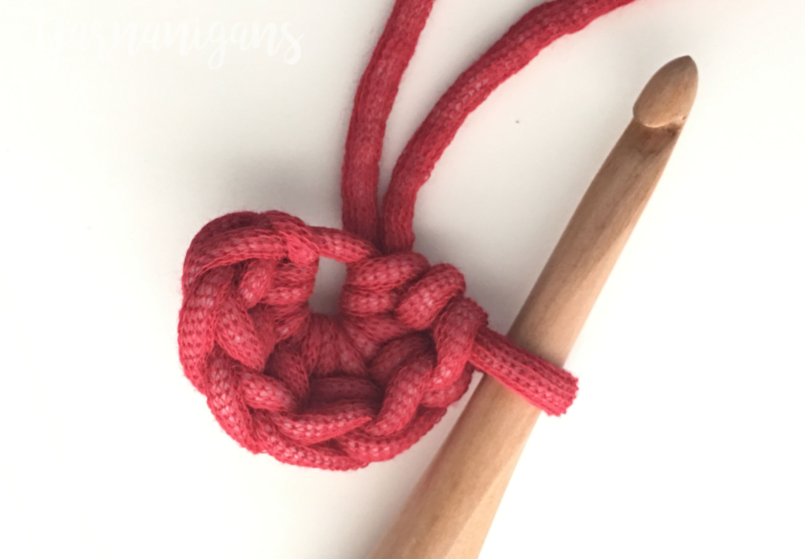 Adjustable loop: Holding the yarn a few inches from the end, wrap around your finger. Do not remove. Insert hook into the wrap and draw up a loop of working yarn. Chain one to secure the loop, then remove from finger. Work stitches of first round in the loop. Pull gently, but firmly, on tail to tighten.