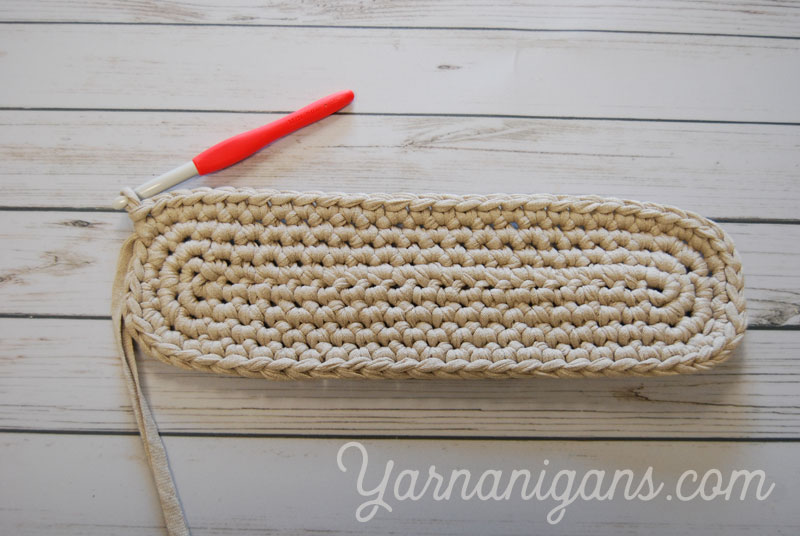 Round 1: sc twice in 2nd ch from hook. sc in next 18 ch across. Work 3 sc in last st of foundation ch. Instead of turning to work back across the sc stitches you just made, rotate your work clockwise vertically and continue crocheting in the bottom loops of the foundation ch. 19 sc across. – 42 sc
